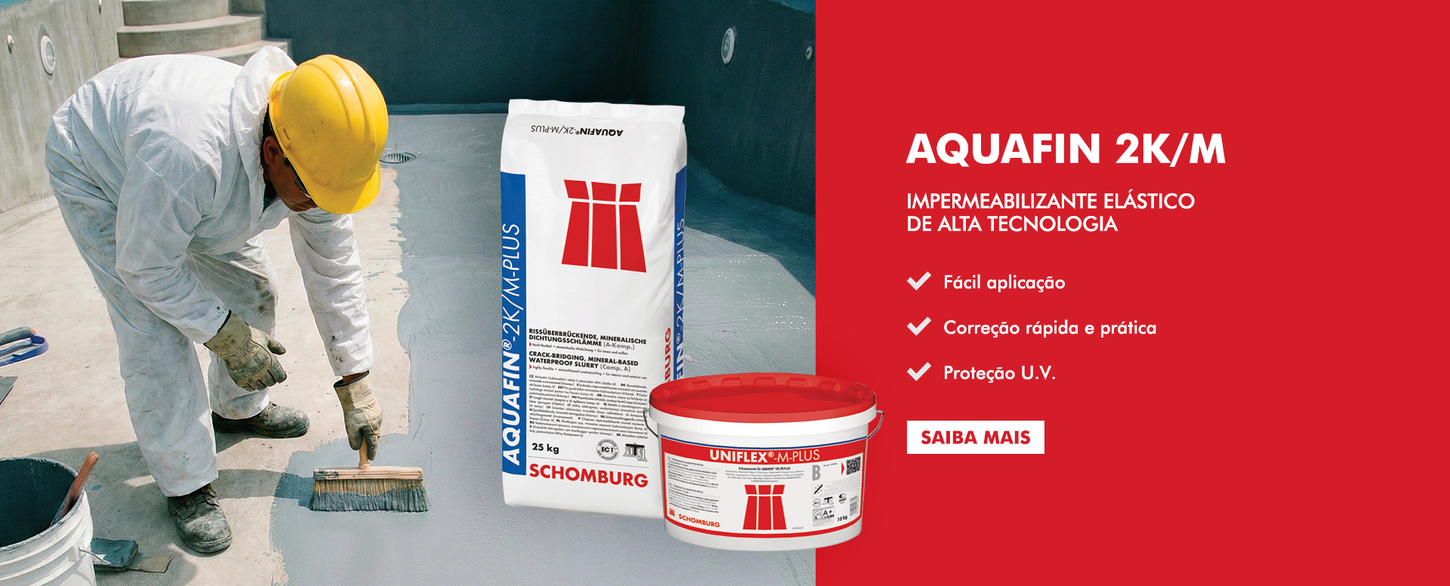 A AQUAFIN DO BRASIL é a distrbuidora dos produtos Schomburg no Brasil. Dentre eles podemos destacar alguns impermeabilizantes de comprovada eficácia e incomparável desempenho diante de produtos similares nacionais, como AQUAFIN 1K, AQUAFIN 2K/M e SANIFLEX. Além da distribuição dos produtos, a AQUAFIN DO BRASIL conta com equipe de suporte técnico, sempre pronta para esclarecer dúvidas e disponibilizar informações de aplicação, durabilidade e demais características dos produtos.